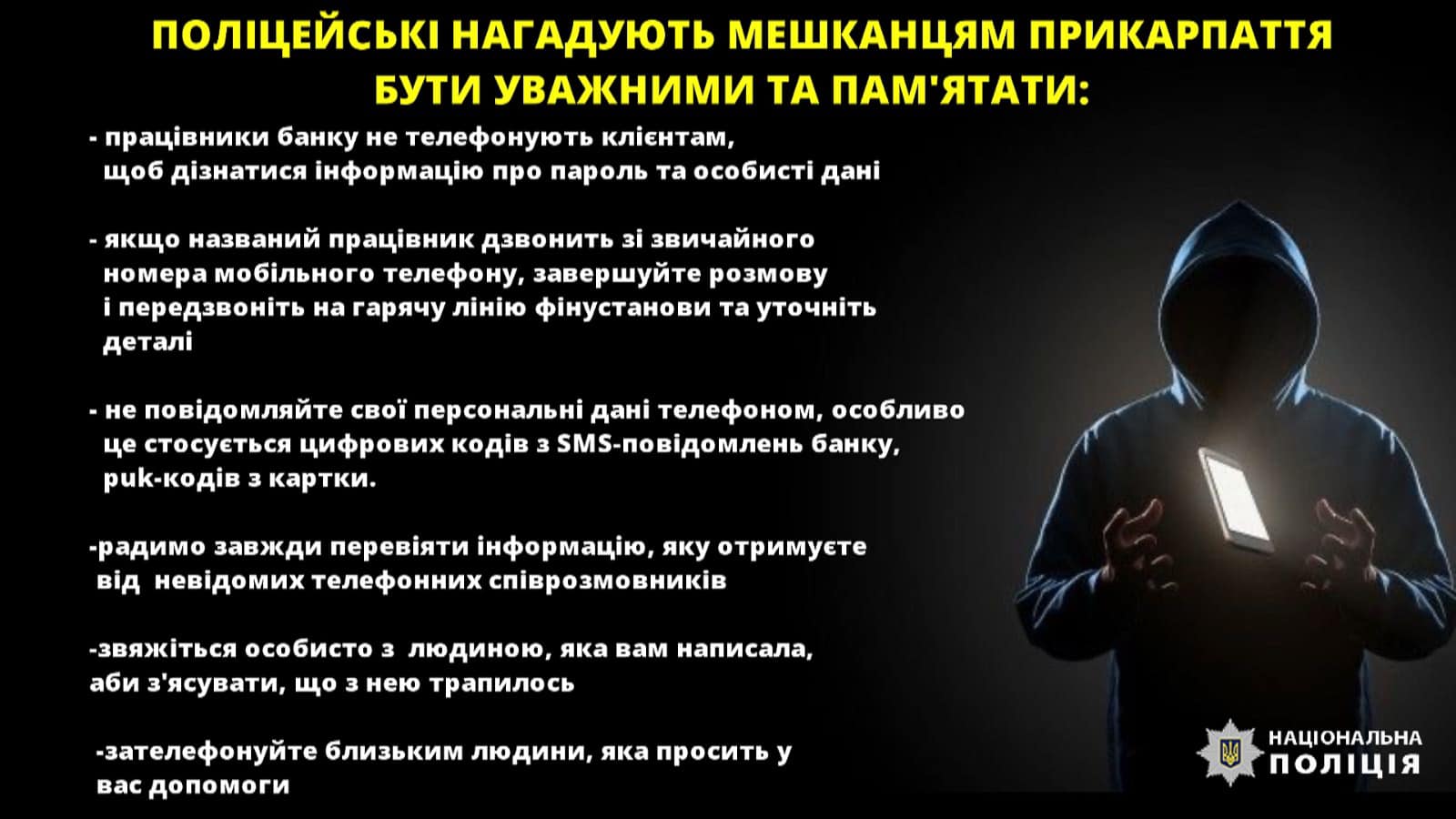 Наступні шахрайські дії задокументували надвірнянські поліцейські. До потерпілої зателефонував невідомий і представився працівником банку. Незнайомець ввів жінку в оману та повідомив, що з її банківської карти намагаються зняти гроші. А щоб цього не трапилось, заявниці необхідно було продиктувати незнайомцю реквізити своєї банківської карти, що потерпіла і зробила. Після чого виявила зникнення близько 4 тисяч гривень зі свого рахунку.