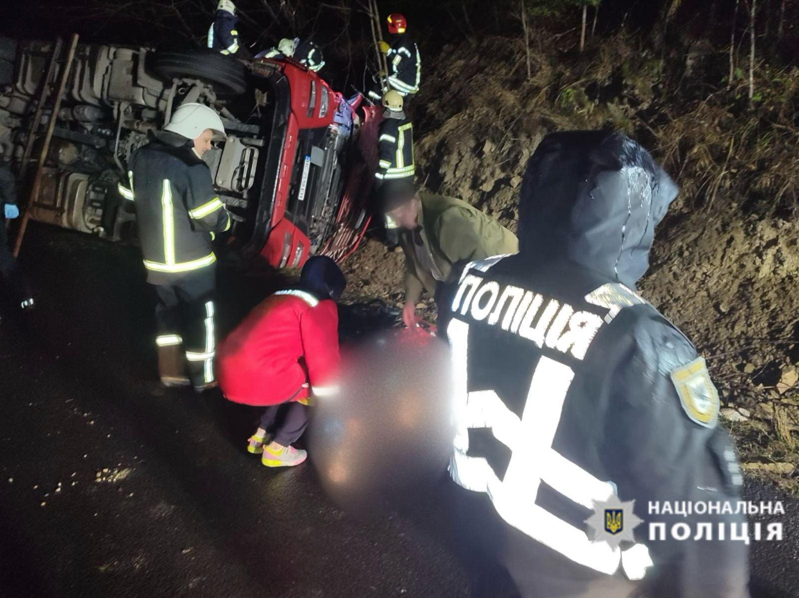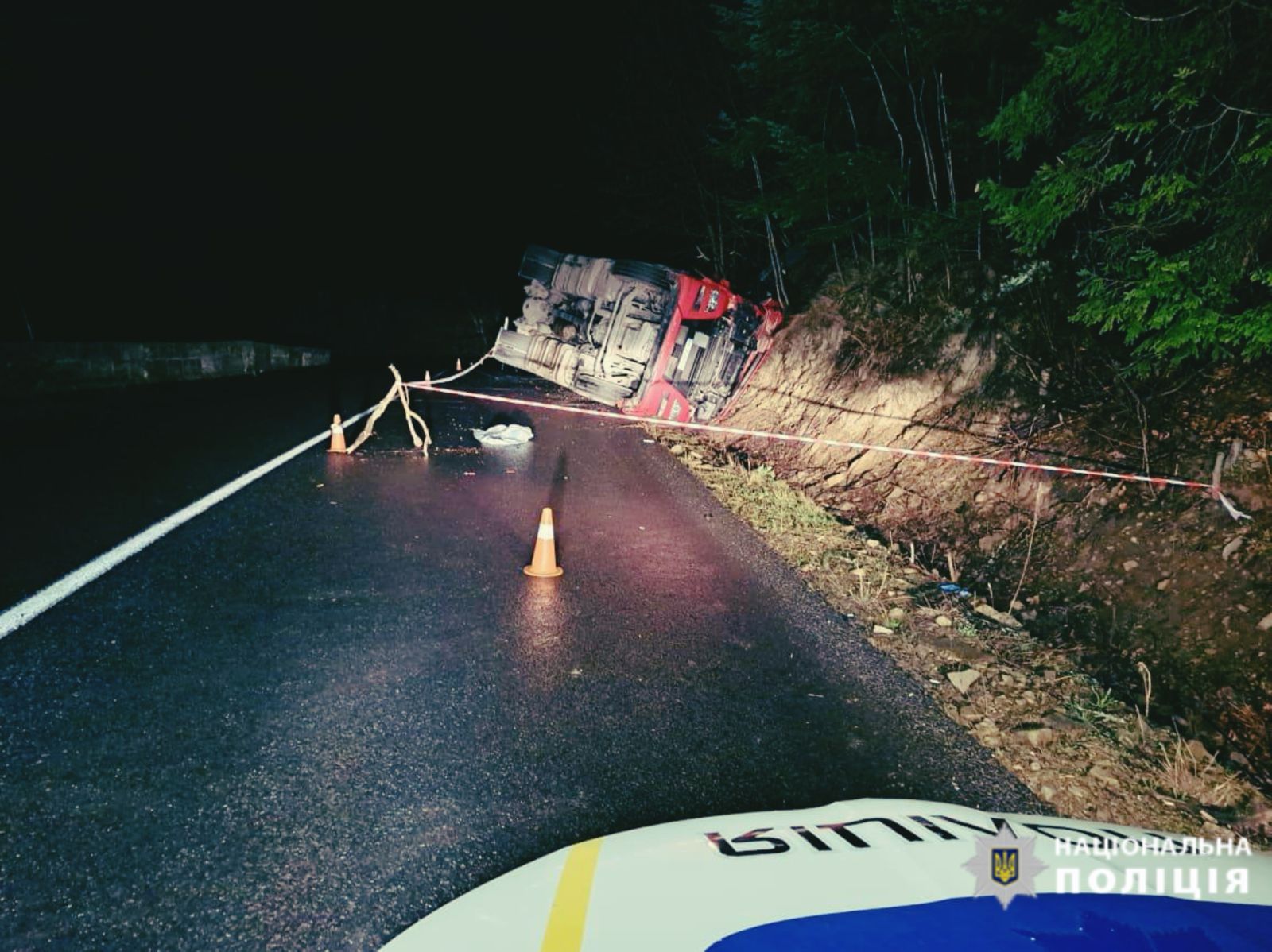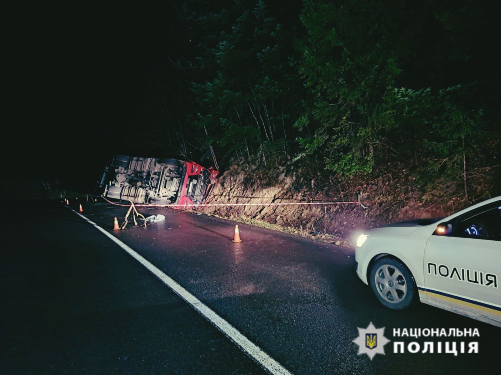 Наступна смертельна аварія трапилась цього ж дня близько 20 години поблизу села Мислівка, Вигодської ТГ. Відомо, що 46-річний водій вантажного тягача «MAN», на повороті під нахилом, не впорався із керуванням та допустив виїзд за межі проїзної частини і перекинувся.