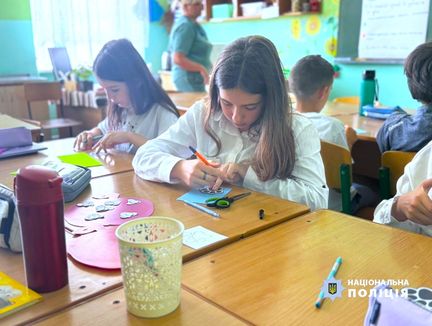 Спершу поліцейська розповіла учням про основні правила дорожнього руху та запропонували разом виготовити флікери. Такі елементи безпеки необхідні засоби для кожного юного пішохода.
