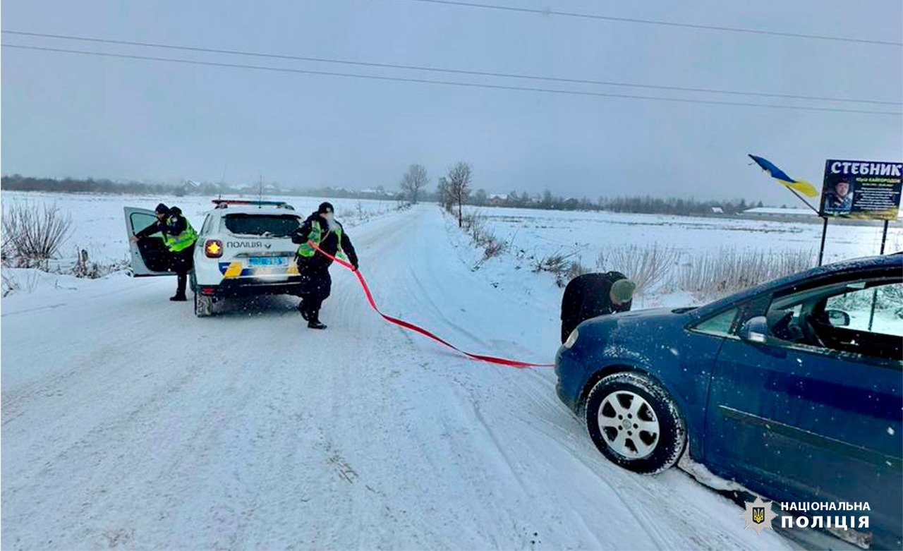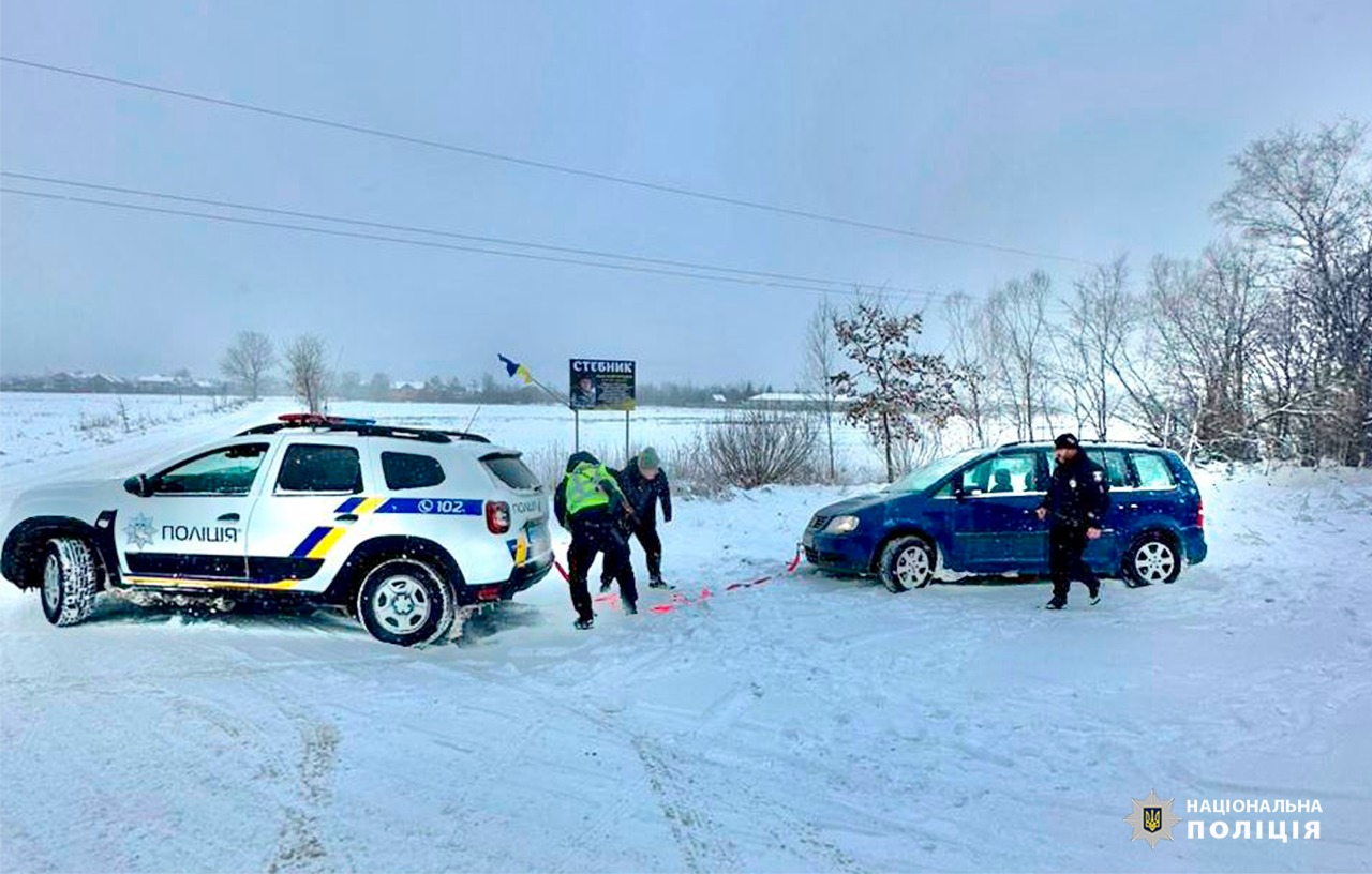 Поліцейські спільно з рятувальниками витягають транспортні засоби, буксирують та виштовхують автівки на проїзні ділянки доріг.