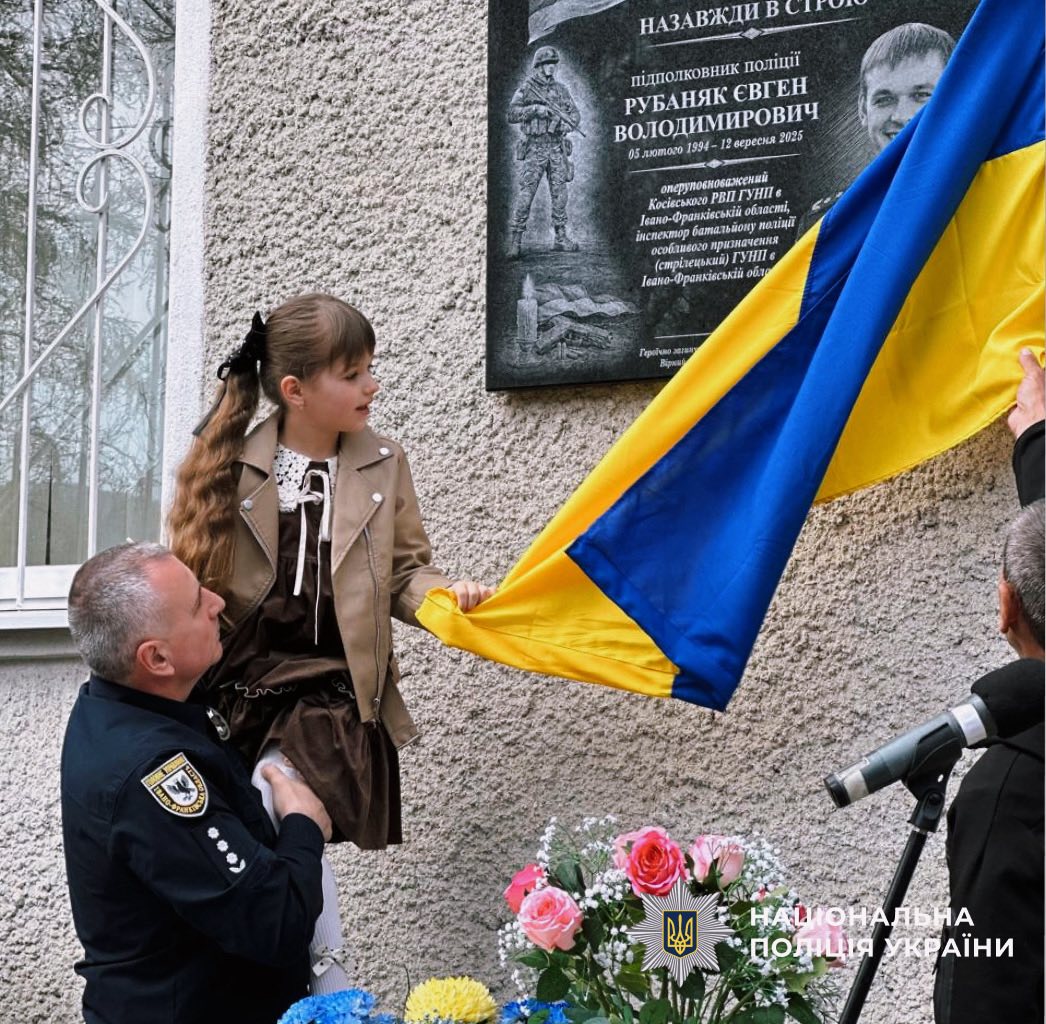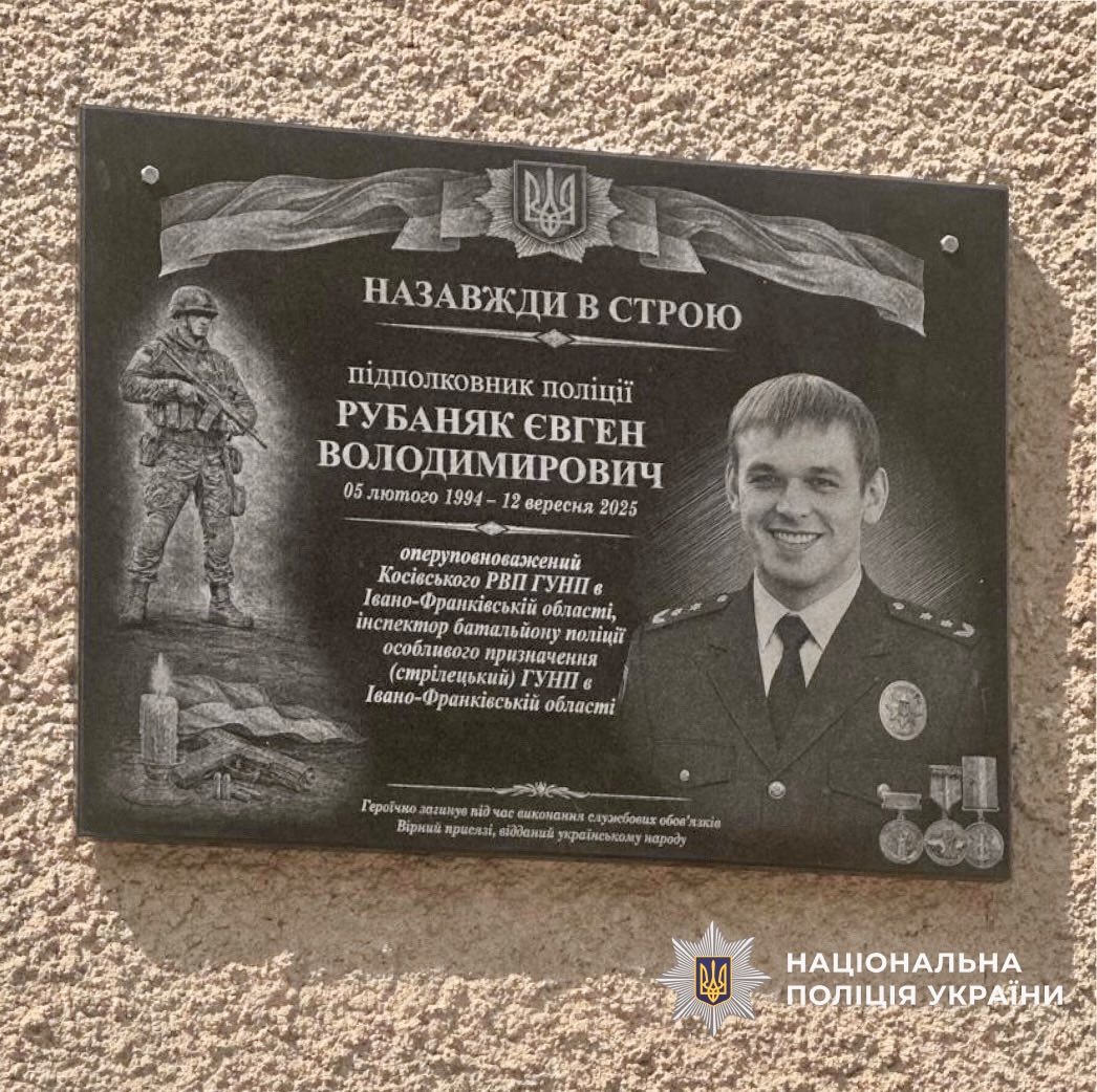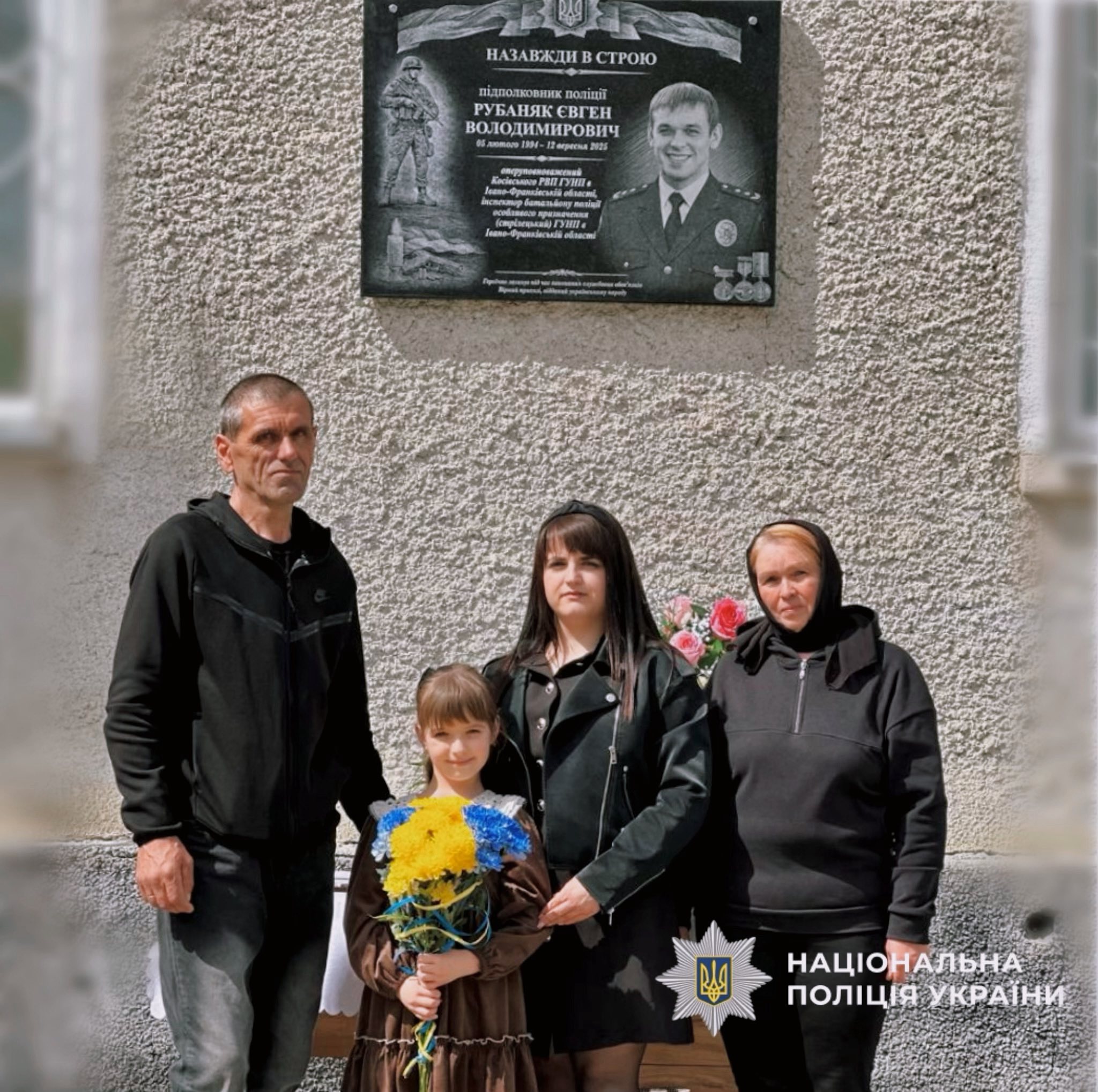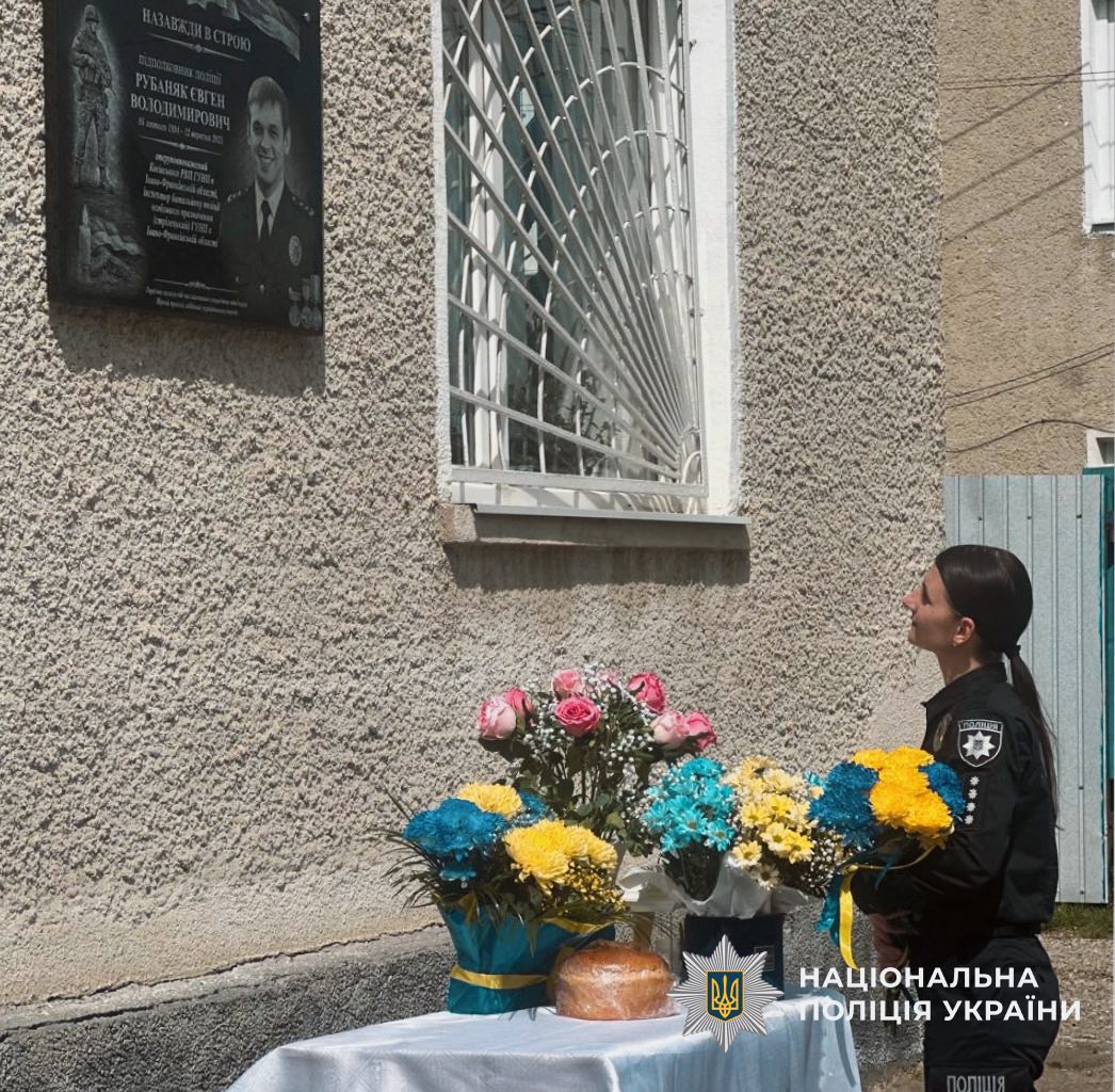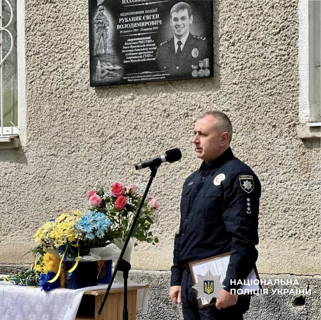 15 квітня у Косові на фасаді районного відділу поліції відкрили пам’ятний знак полеглому Захиснику України, поліцейському Євгену Рубаняку, який віддав життя за незалежність і територіальну цілісність держави.
