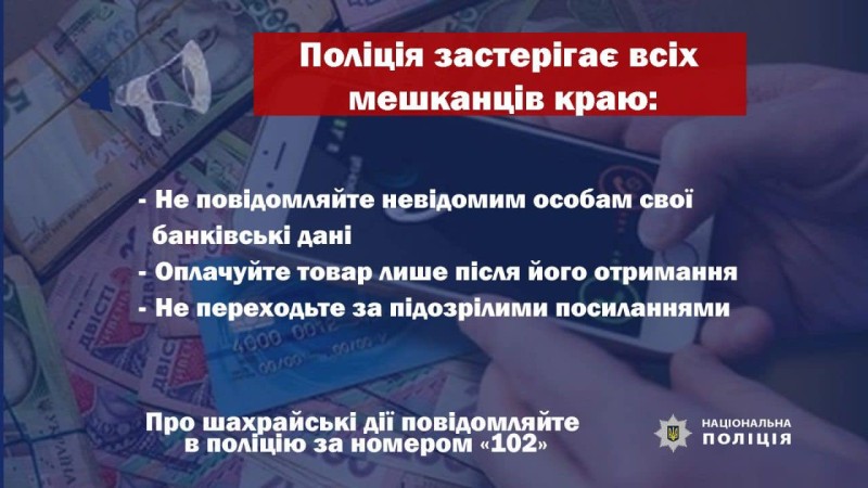 Будьте обережними, щоб не стати жертвою телефонного та інтернет шахрайства. У жодному разі не виконуйте вимоги незнайомців, які вам телефонують чи пишуть в мережі. Про підозрілі дзвінки та шахрайські дії повідомляйте поліцію за номером «102».