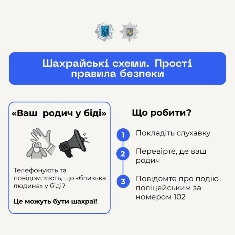 Поліцейські застерігають: якщо Вам телефонують з повідомленням про те, що ваші близькі, родичі чи знайомі потрапили у лікарню, вчинили кримінальне правопорушення або їх затримали правоохоронці і вимагають кошти для вирішення проблеми, то в жодному разі не перераховуйте гроші на вимогу невідомих осіб.