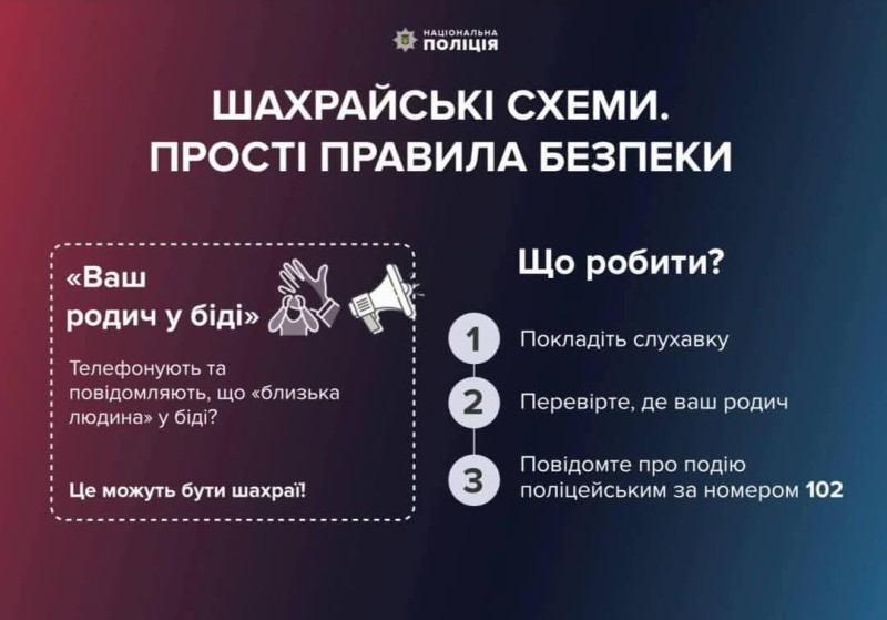 Поліцейські закликають громадян не довіряти незнайомцям, які телефонують та просять грошової допомоги для ваших близьких. Спочатку слід особисто переконатися, чи дійсно близькі потребують коштів.