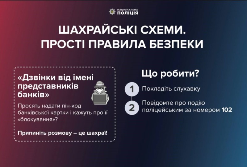 - якщо висувають умову, що для виконання певних дій потрібно повідомити пін-код вашої картки або одноразовий пароль з SMS-повідомлення - негайно завершуйте розмову. Це шахрай!