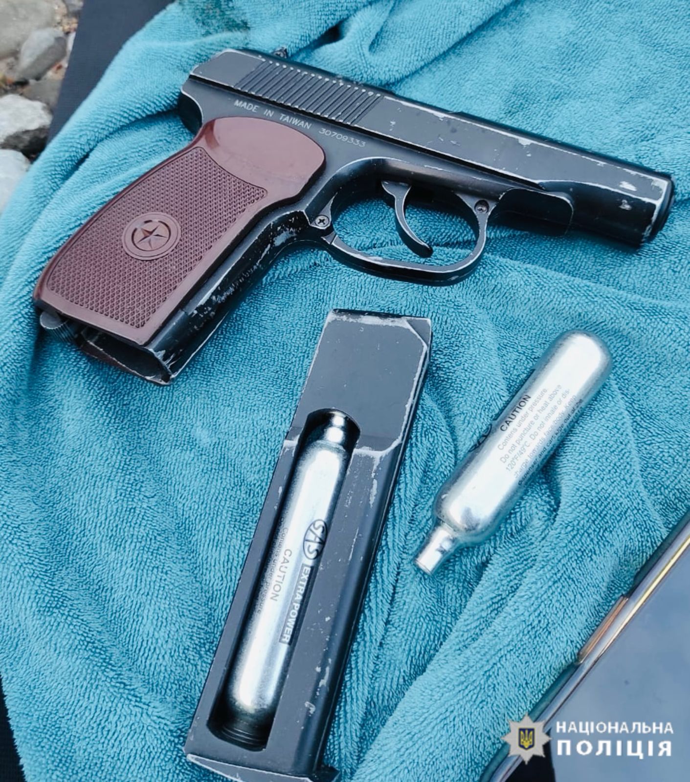 Співробітники вибухотехнічної служби, що також прибули на місце, вилучили предмет, схожий на корпус гранати Ф-1 із запалом. Окрім цього поліцейські виявили та вилучили молоток, пневматичний пістолет та мобільні телефони. Речові докази направили на експертизу.