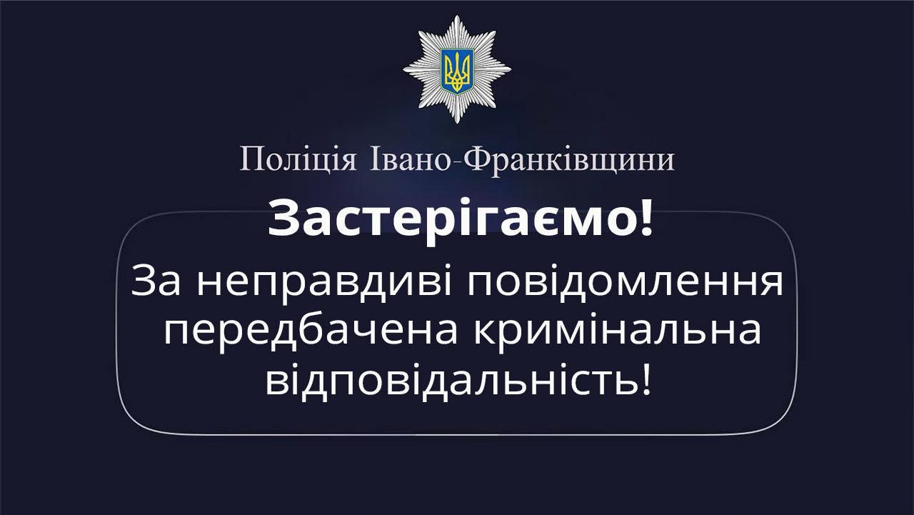 Поліція Прикарпаття нагадує, що хибні повідомлення про замінування – це серйозне правопорушення. Відповідно до статті 259 Кримінального кодексу України, завідомо неправдиве повідомлення про підготовку вибуху карається позбавленням волі на строк від 2 до 6 років. Якщо ж об'єктом стають критично важливі об'єкти інфраструктури – школи, лікарні, урядові установи, це передбачає покарання у вигляді ув'язнення до 8 років.