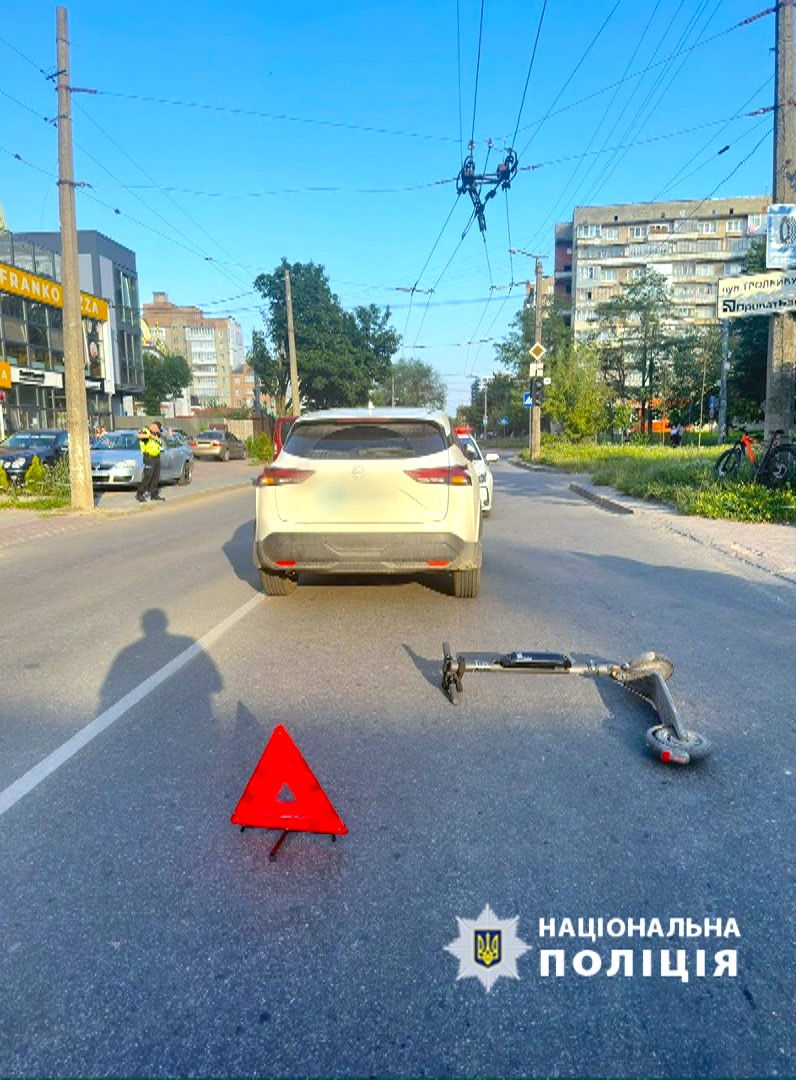 Близько 18:10 вечора ДТП трапилось і в Івано-Франківську. Встановлено, що по вул. Хіміків 25-річний водій, проїжджаючи перехрестя, допустив зіткнення з 44-річною місцевою мешканкою, яка рухалась на електросамокаті. В попутному напрямі по правому боці. Жінка отримала тілесні ушкодження та доставлена в обласну лікарню. Водій був тверезий.