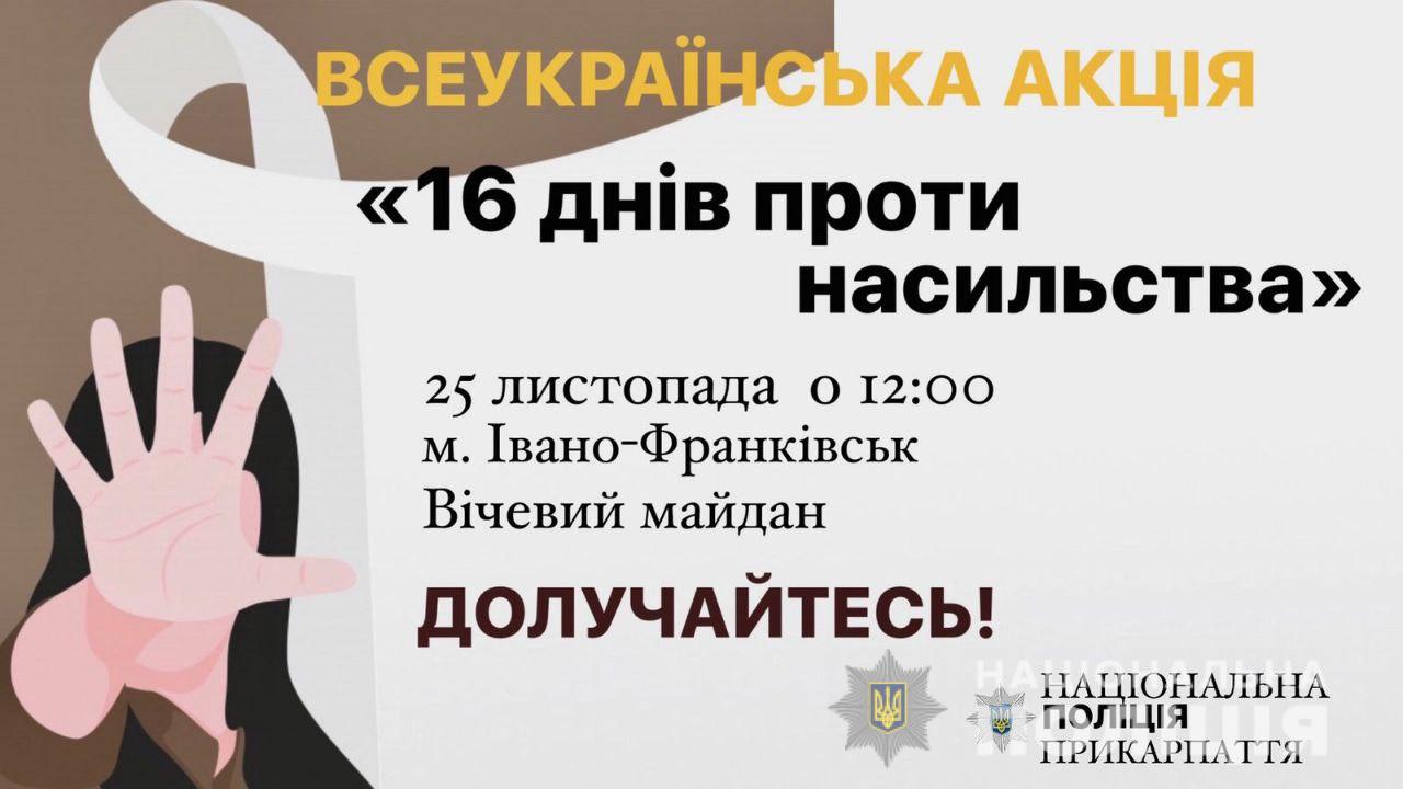 Щорічно в Україні з 25 листопада до 10 грудня триває Міжнародна кампанія «16 днів проти насильства», яка з 1991 року підтримується міжнародною спільнотою. До кампанії долучаються поліцейські Прикарпаття та запрошують мешканців та гостей також не бути байдужими і приєднуватися.