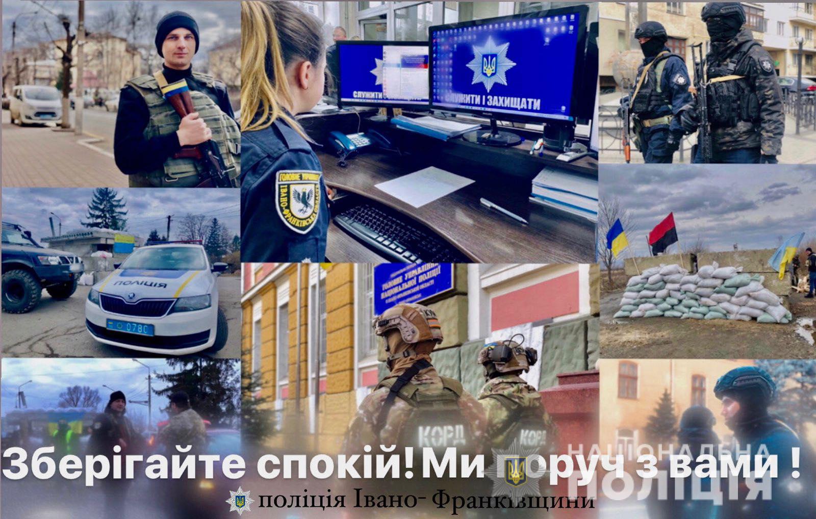 Поліцейські Івано-Франківщини охороняють спокій громадян цілодобово. Усі стратегічні об'єкти краю під охороною. Правоохоронці спільно з представниками територіальної оборони несуть службу на блокпостах та з громадськими формуваннями у складі мобільних груп посилено патрулюють вулиці Івано-Франківська та населених пунктів області.