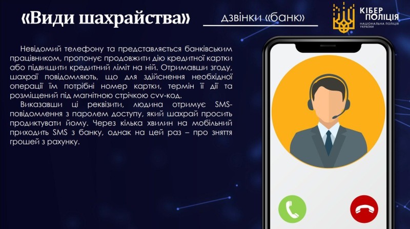 Пам’ятайте, що ким би не представся співбесідник телефоном і які б приводи не називав, не повідомляйте ніколи дані своєї банківської картки, особливо CVV, терміну дії картки, одноразових паролів з SMS, даних для авторизації в онлайн-банкінгу.