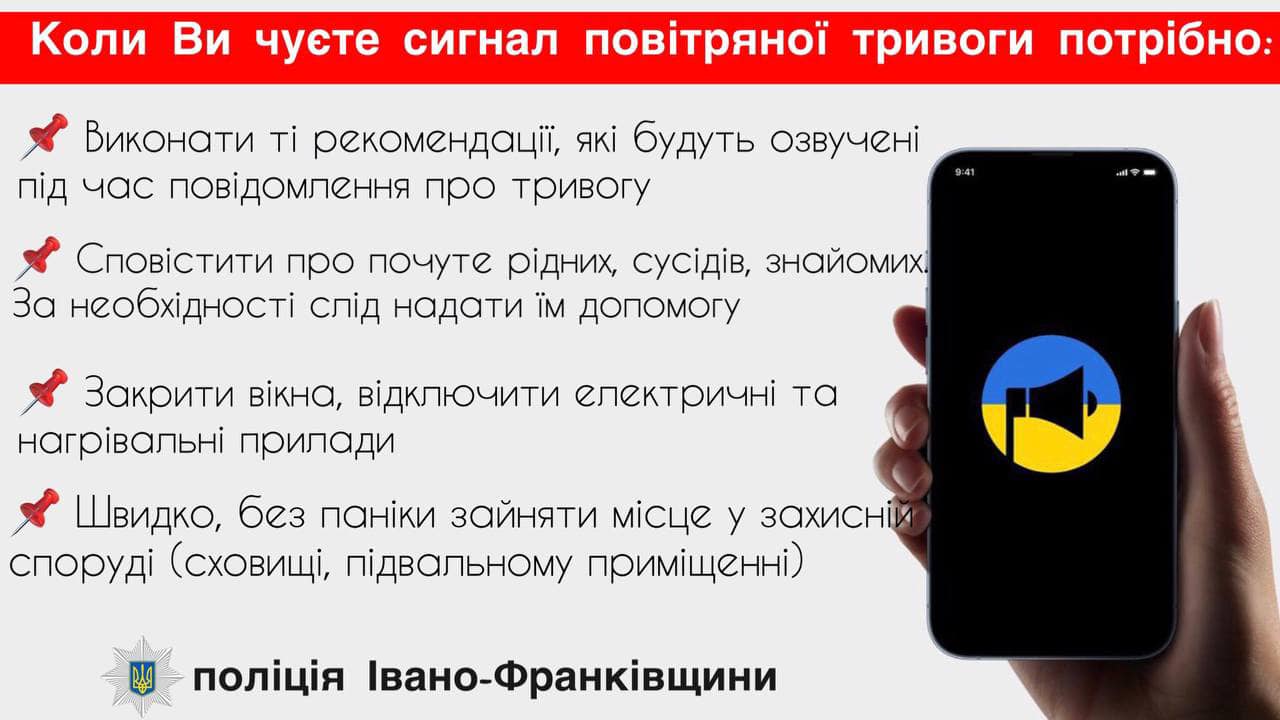 Прикарпатські поліцейські закликають всіх мешканців області не нехтувати тривожним сповіщенням та пам’ятати про власну безпеку.