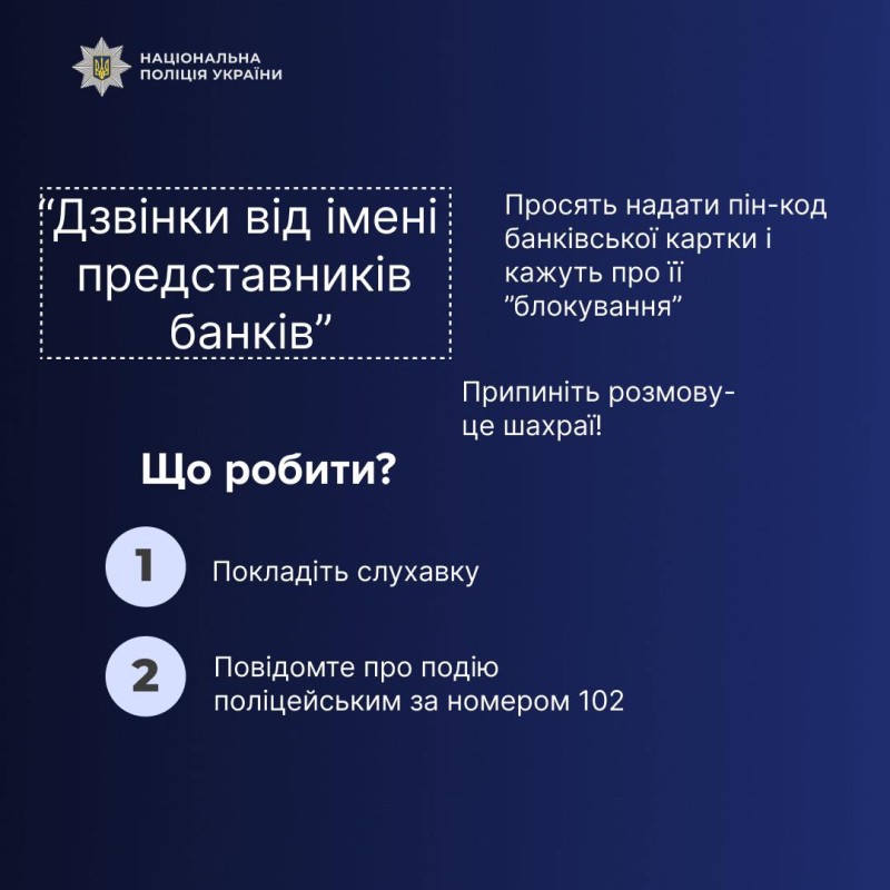 Поліцейські вкотре закликають громадян бути обачними: ніколи не повідомляйте стороннім особам реквізити своєї банківської картки чи коди з SMS. Якщо вам телефонують із подібними запитами — одразу припиняйте розмову й звертайтеся до банку за офіційним номером.