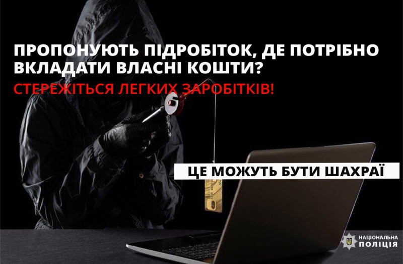 -не спокушайтеся на вигідні умови онлайн-заробітків (обіцянки вкрай високих прибутків, швидкого кар’єрного зростання, вимоги вкладати власні кошти для «старту» - це ознаки шахрайства);