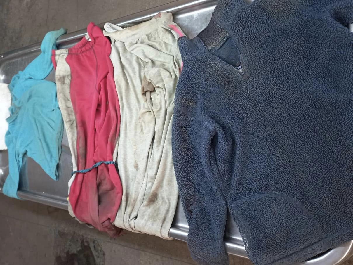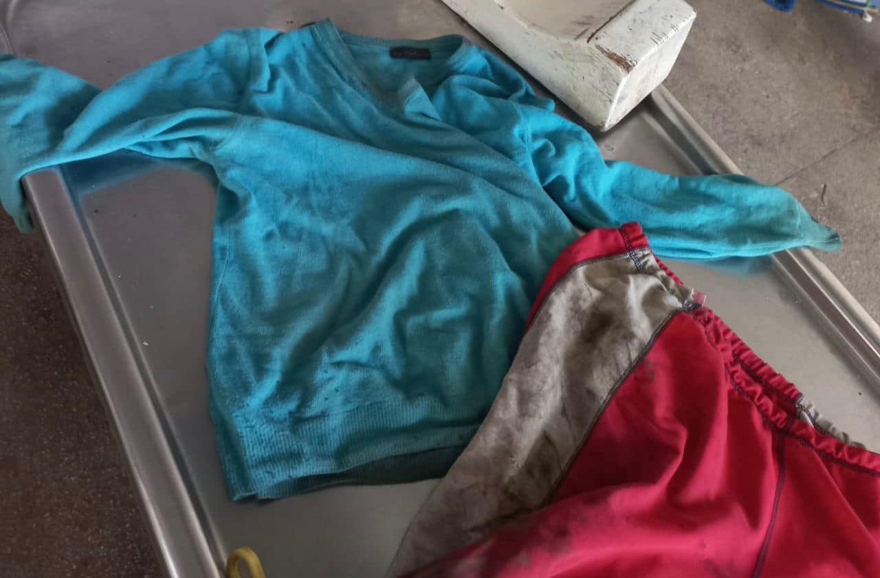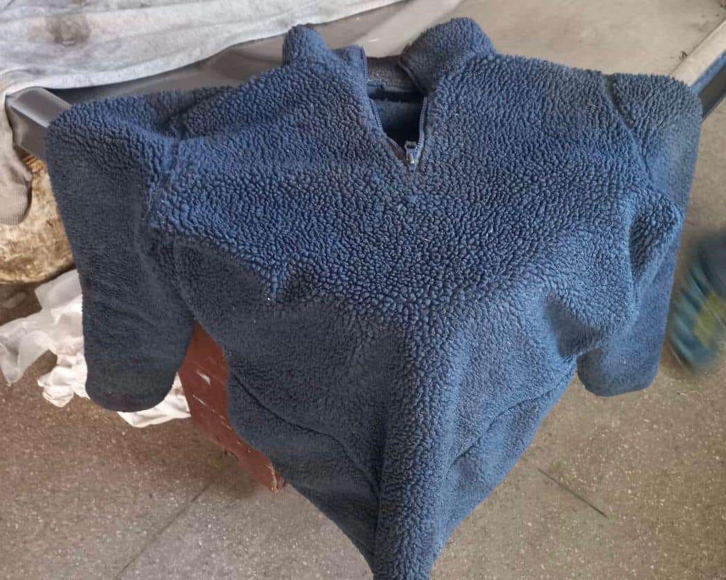Був одягнений у сірий батник, штани червоного кольору з білими полосами.
