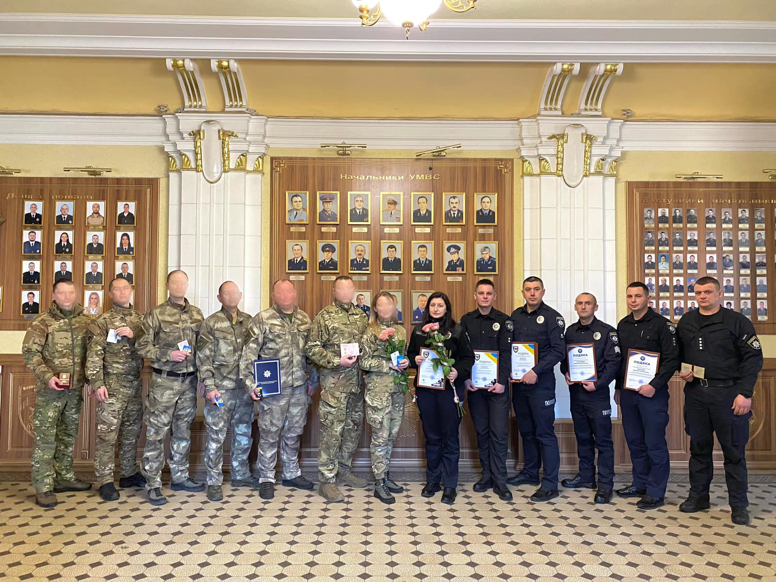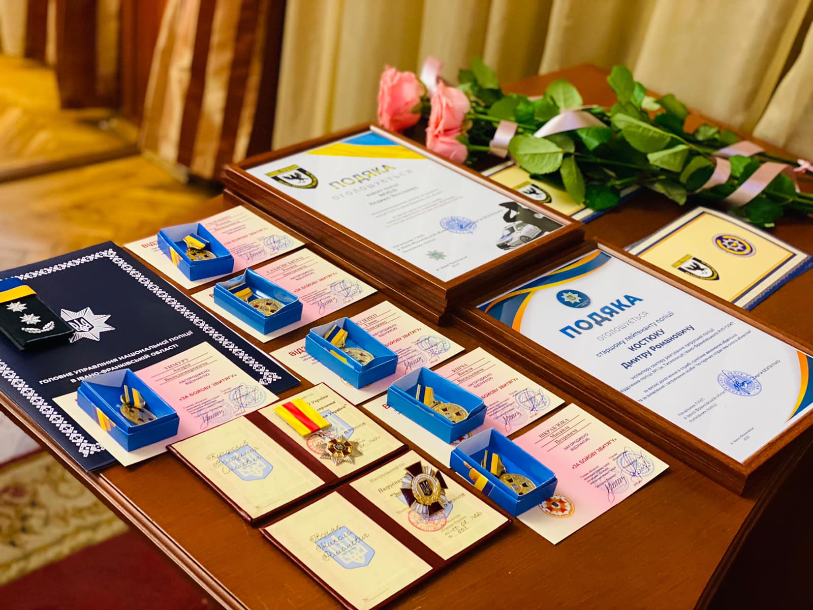А відзнаку Міністерства оборони Україну вручили підполковнику поліції Миколі Івонюку. Командир роти патрульної поліції особливого призначення «Івано-Франківськ» отримав «Знак пошани». Також відзнаку «За сприяння Збройним Силам України» отримав капітан поліції Володимир Курдюков. А чергове спеціальне звання та медаль «За бойову звитягу» отримав майор поліції, заступник начальника управління «Корпус оперативно-раптової дії» Андрій Тимур. Медалі отримали і троє співробітників «КОРДу».