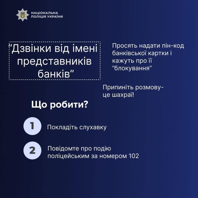Поліція Прикарпаття нагадує: жоден справжній банківський працівник ніколи не проситиме повідомити PIN-код або одноразові паролі з SMS. Не переказуйте кошти за вказівками незнайомців по телефону. Будьте пильні та обачні!