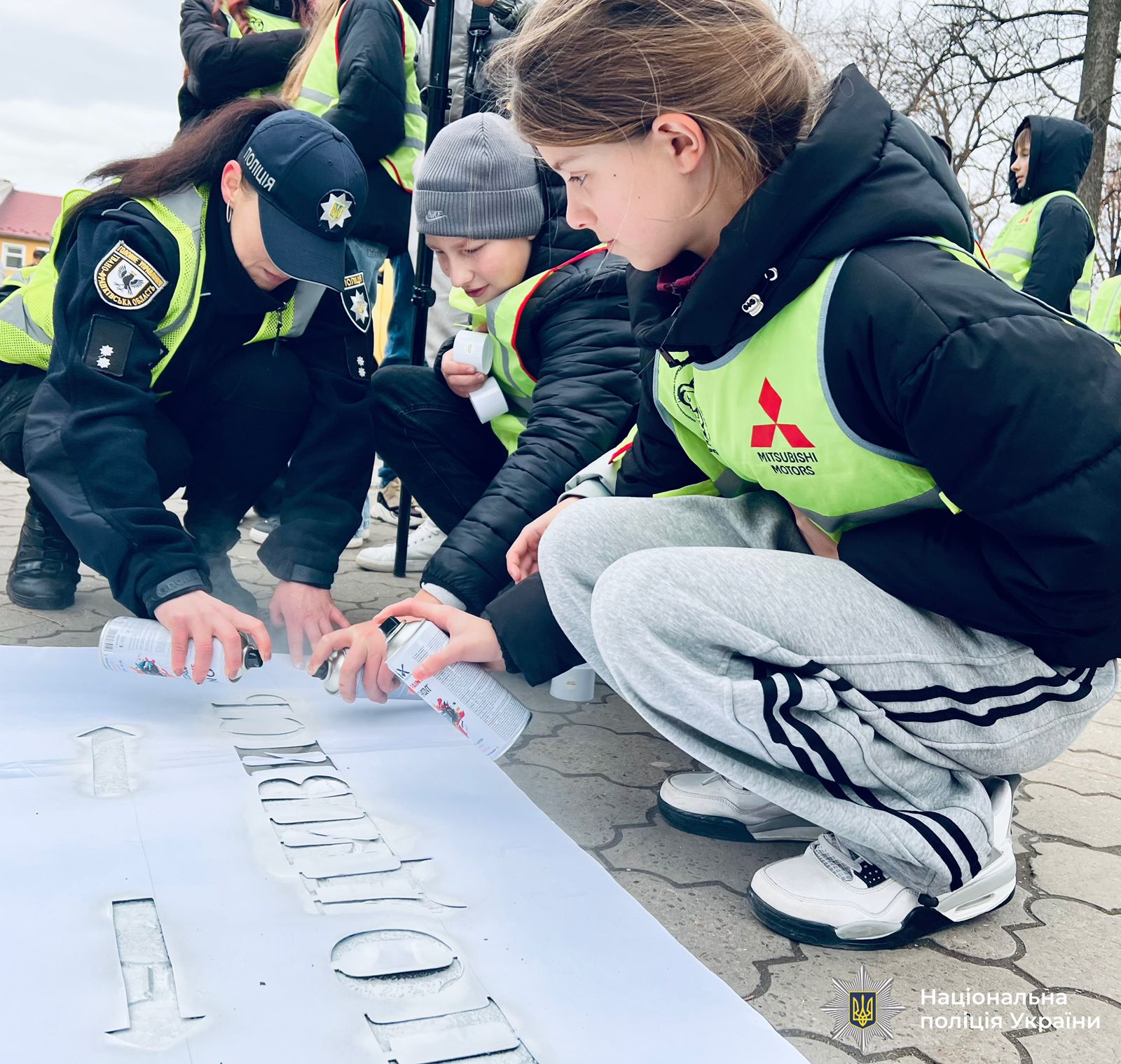 Правоохоронці разом із ліцеїстами спілкувалися з перехожими, запитували, чи пам’ятають ті правила переходу дороги, чи користуються світловідбивними елементами у темну пору доби. А ще розфарбовували асфальт біля пішохідних переходів яскравими попереджувальними написами: «Зніми навушники», «Поклади телефон», «Злізь з велосипеда» - прості, але надзвичайно важливі нагадування, які можуть врятувати життя.