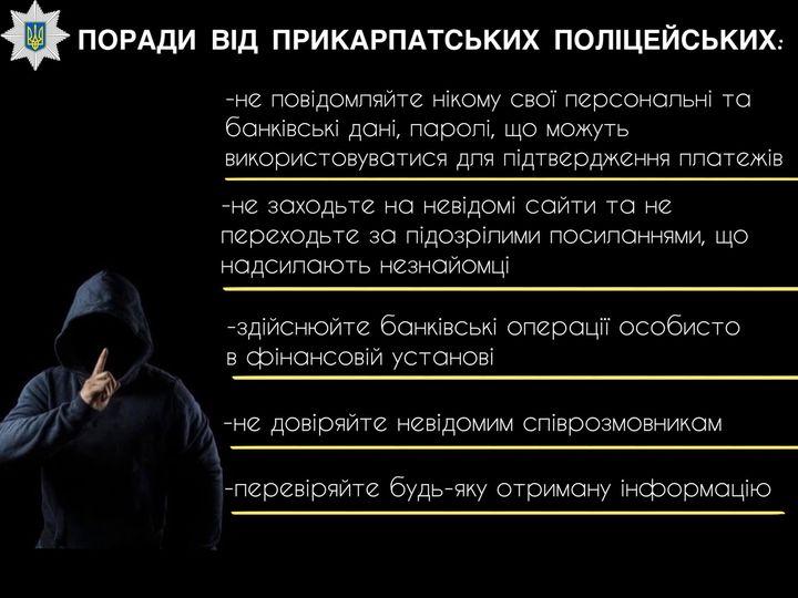 Поліцейські нагадують декілька простих порад, які допоможуть не попастися на гачок аферистів:
