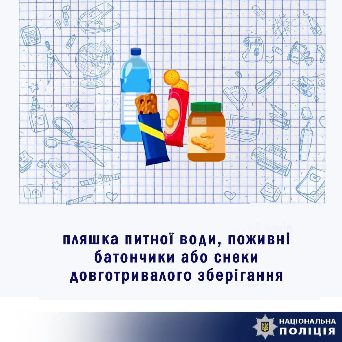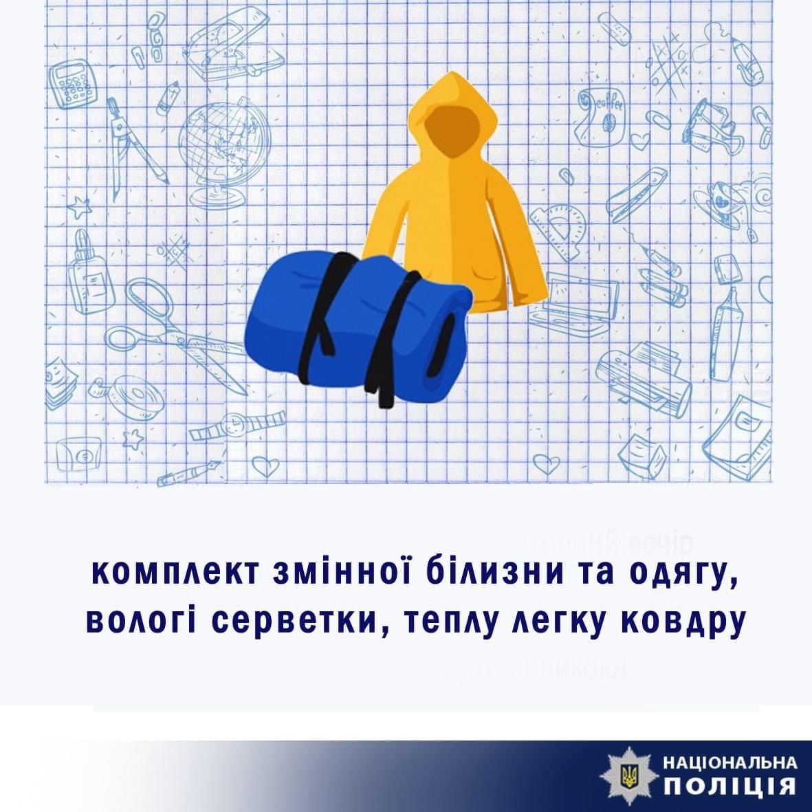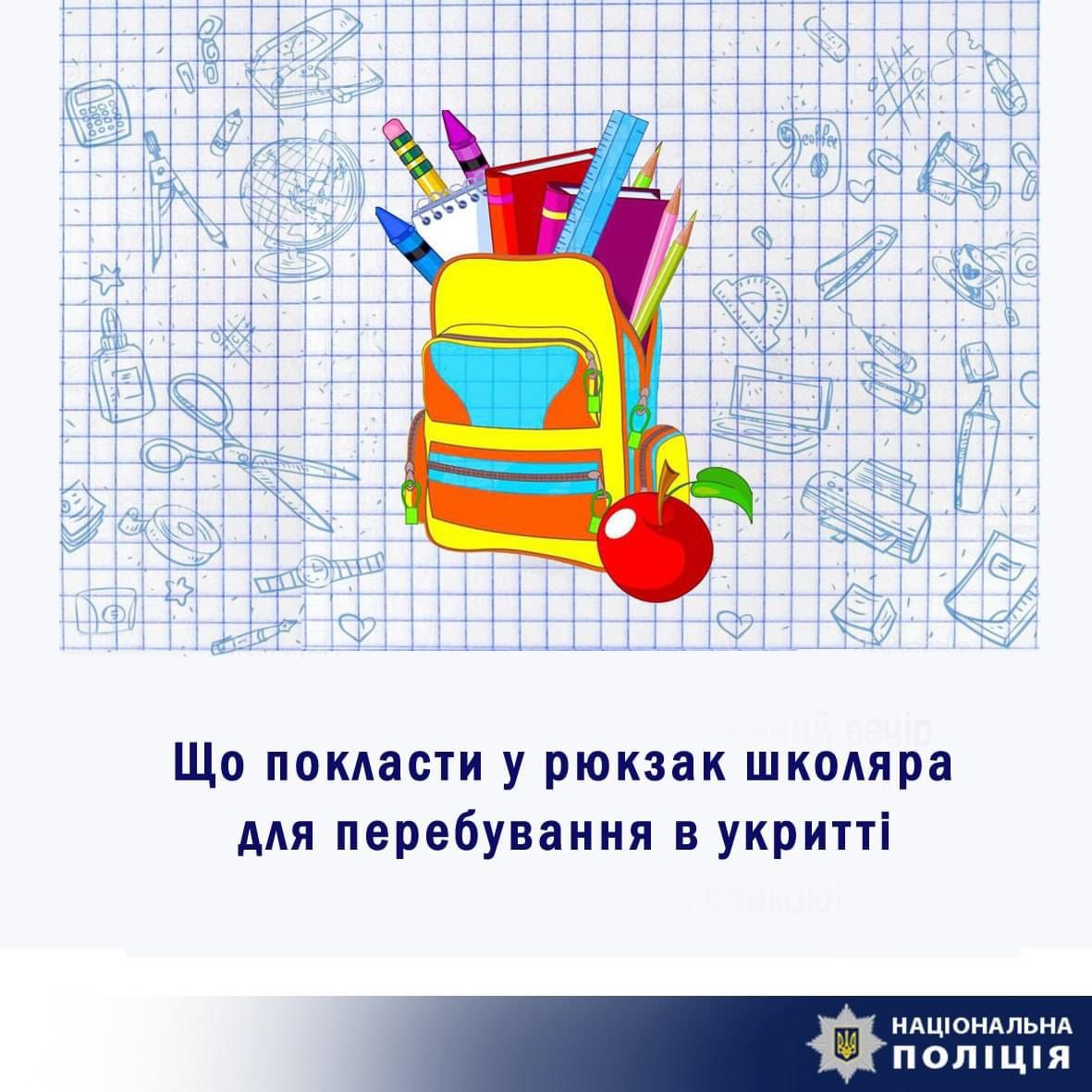 Розпочався новий навчальний рік, який триває за підвищених заходів безпеки. Тому, поліцейські радять батькам, що потрібно покласти в рюкзак дитини, яка навчається очно у школі. Якщо ваша дитина навчатиметься офлайн, то під час можливої евакуації чи спуску до укриття, вона братиме з собою наплічник.