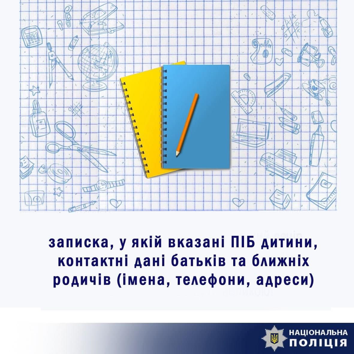 - нотатка від батьків, у якій вказано ПІБ дитини, контактні дані батьків та ближніх родичів (імена, телефони, адреси);