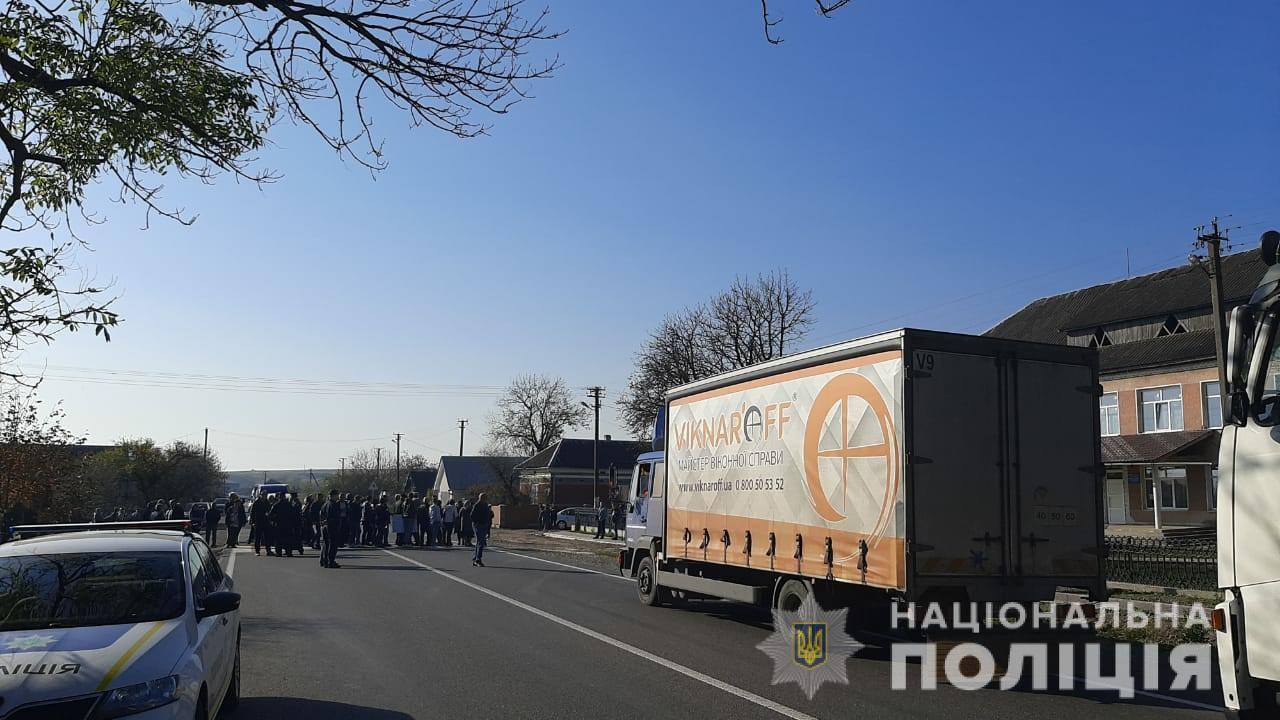 Люди ходять пішохідним переходом у с. Насташине, а транспорт пропускають частково. Поліцейські на місці події і забезпечують правопорядок.