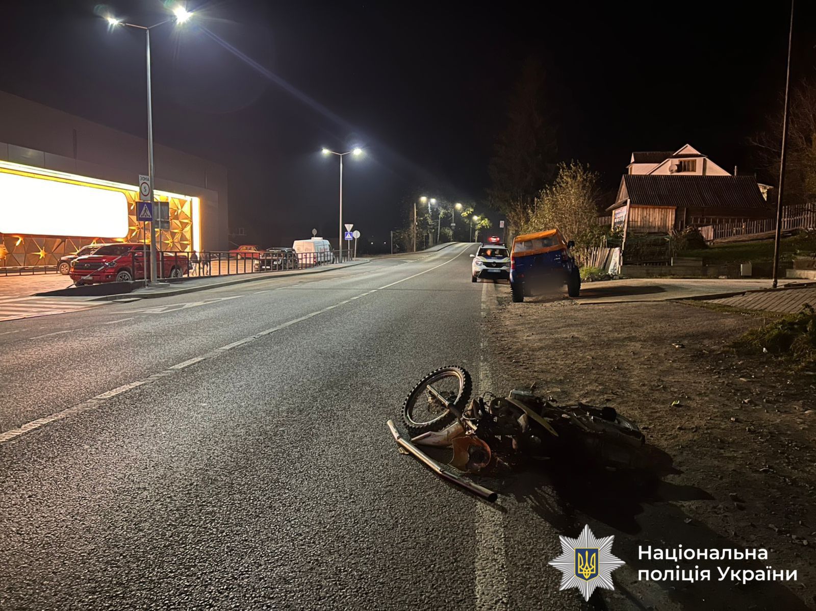 На місці події слідчо-оперативна група встановила, що 38-річний місцевий мешканець, керуючи автомобілем «Suzuki Jimny», проявив неуважність, виїжджаючи із території магазину на автодорогу державного значення, та допустив зіткнення з мотоциклом «Spark», яким керував неповнолітній житель Микуличина.