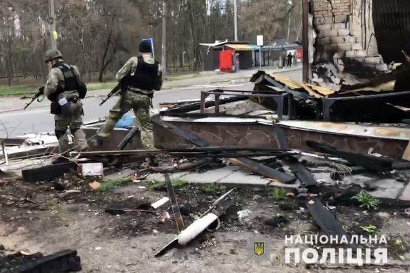 Поліцейські виявляють тіла загиблих під час бойових дій, фіксують пошкодження будівель, разом з рятувальниками розміновують будівлі та автошляхи. Правоохоронці заступають на блокпости, виявляють мародерів, колаборантів, перевіряють транспортні засоби. Контролюють пасажиропотік на відкритих ділянках доріг, зокрема на Житомирській трасі.