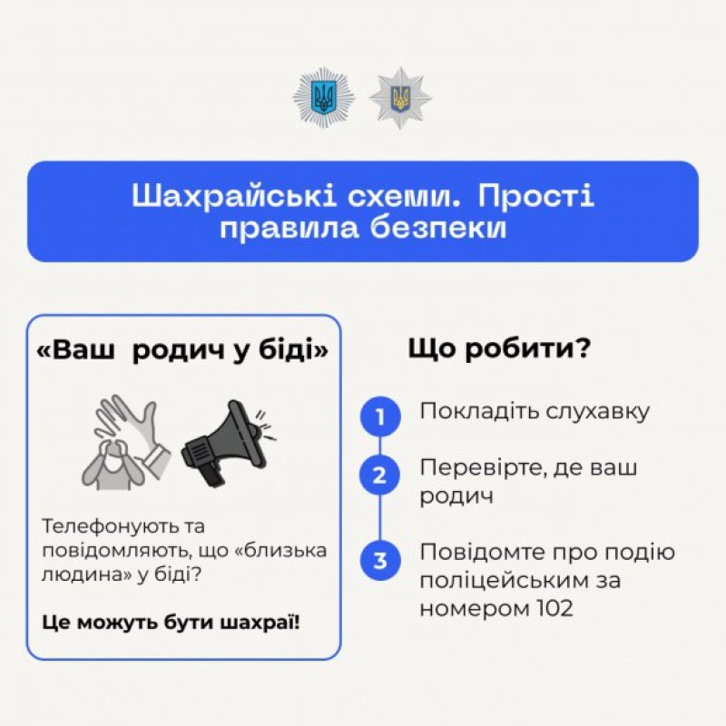 Якщо до Вас телефонують з невідомих номерів і повідомляють, що ваш родич чи близька людина потрапила в скрутну ситуацію, скоїв ДТП, вчинив конфлікт. Пам'ятайте - це шахраї.
