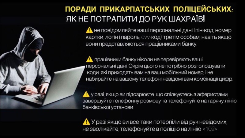 Правоохоронці вкотре закликають громадян бути обачними та не довіряти телефонним шахраям, які намагаються дізнатись реквізити Ваших банківських карток або спонукають Вас до необдуманих, банківських операцій! За жодних обставин не розголошуйте конфіденційну інформацію (пін-код, номер картки), за допомогою якої зловмисники можуть привласнити Ваші кошти! Якщо ви сумніваєтесь чи дійсно вам телефонує справжній співробітник банківської установи, запитайте, коли та в яке відділення Ви можете підійти й розв'язати проблему особисто, а не під час телефонної розмови. Якщо ви запідозрили, що Вас намагаються ошукати, одразу телефонуйте до поліції за номером «102».