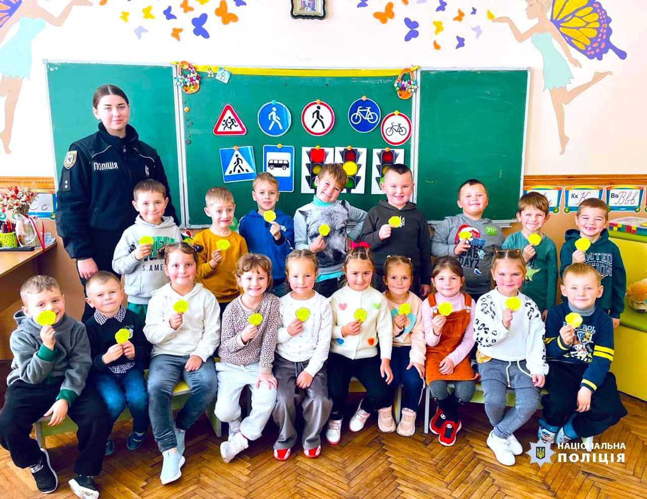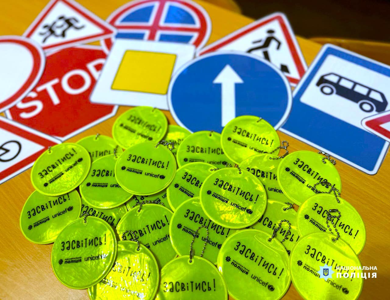 формі офіцери розповіли дітям про основні правила дорожнього руху, безпеку на дорозі у темний час доби та подарували світловідбиваючі елементи, які розроблені дитячим фондом ООН (ЮНІСЕФ).